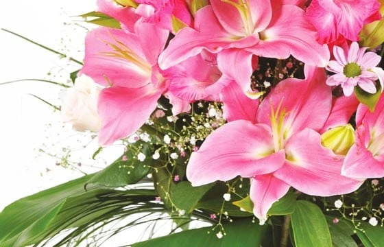 DĂ©tails du bouquet : glaĂŻeuls ou des mufliers roses, des lys orientaux roses, des chrysanthĂšmes multi fleurs roses, des roses rose, quelques gypsophile, feuillage telles que des feuilles d’aspidistra ou de coco, et du beer grass (Fleurs variables selon les saisons et la disponibilitĂ© en magasin tout en gardant l’esprit la forme et les couleurs)(RĂ©f. Florale 1204, Eclatant). Visuel non contractuel, visuel correspondant Ă la formule Meilleur Compromis.