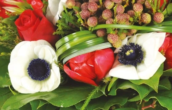 Détails du bouquet : Fleurettes et petites roses dans les tons rouge, blanc et vert composé d’anémones blanches, hypéricum, feuillage de beargrass tourné à l’intérieur, 2 ruban rouge et blanc le tout terminé harmonieusement par une collerette de salal (Fleurs variables selon les saisons et la disponibilité en magasin tout en gardant l’esprit la forme et les couleurs)(Réf. Florale 1244, Evidence.)Visuel non contractuel, visuel correspondant à la formule Meilleur Compromis – Non disponible pour les Dom-Com
