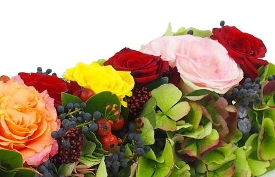 Détail de la création florale : Chemin de roses colorées, piquées pour un deuil. Cette création florale réalisée par un artisan fleuriste local est composée de rose, baie de saison, hortensia et une pointe de feuillage. Longueur 50 cm environ (Formule « Meilleur compromis »)(Fleurs variables selon les saisons et la disponibilité en magasin tout en gardant l’esprit, la forme et les couleurs)(Ref Florale : 9335 – Socrate). Visuel non contractuel – Visuel correspondant à la formule Meilleur Compromis – Non compatible avec une crémation.