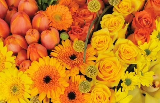 DĂ©tails du bouquet : refour jaune, rose jaune, rose orange, santini vert, gerbera jaune, gerbera orange, tulipe orange (selon saison), fleuron de cymbidium jaune et feuillage. (Fleurs variables selon les saisons et la disponibilitĂ© en magasin tout en gardant l’esprit, la forme et les couleurs.) (RĂ©f. Florale 9208, Murmure.) Visuel non contractuel, visuel correspondant Ă la formule Meilleur Compromis