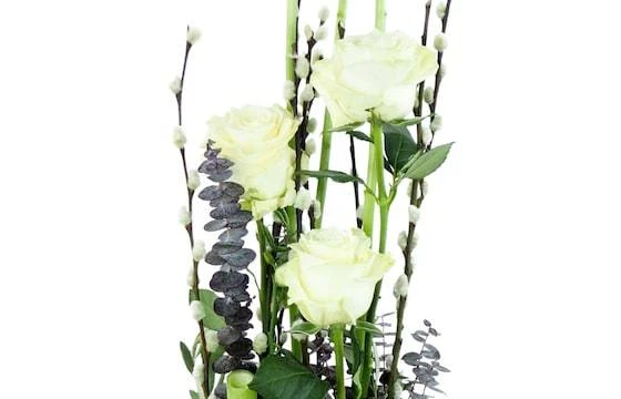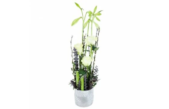 Détail de la composition: Assemblage de fleurs en hauteur blanc et vert. Composé de rose, lys, eucalyptus, chaton et diverse feuillage. Le tout piqué dans un contenant en céramique gris. (Fleurs et contenant variables selon les saisons et la disponibilité en magasin tout en gardant l’esprit, la forme et les couleurs). (Ref Florale : 2314 – Philadelphie). Visuel non contractuel – Visuel correspondant à la formule Meilleur Compromis.