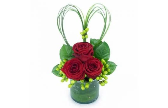 Détail de la composition Vérone : Trois roses rouges gros boutons avec son feuillage, deux hypéricums blancs, un coeur formé de cerclages de bergrass, un contenant cylindrique en verre (contenant variable selon la disponibilité en magasin tout en restant en harmonie avec les fleurs)(Réf : 3124 – Vérone) – Visuel non contractuel