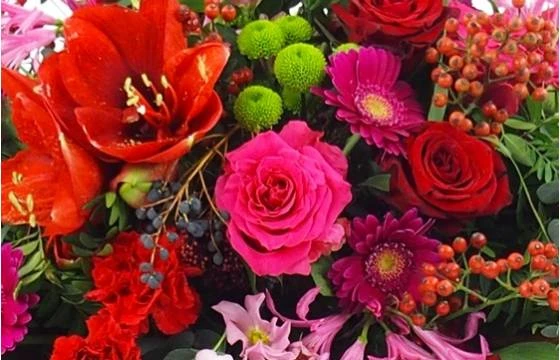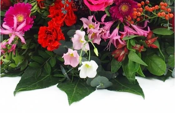 Détail de l’assemblage : Raquette de fleurs piquées allongé pour enterrement dans les tons rouges, fuchsias et roses. Cette création florale est composée de gerbera (ou germini), rose, oeillet, amaryllis (ou lys), santini, baie, fleurette de saison et feuillage. Diverses feuillages à la base et sur les pointes y sont ajoutés. (Fleurs variables selon les saisons et la disponibilité en magasin tout en gardant l’esprit, la forme et les couleurs)(Ref Florale : 9330- Korinthos).Visuel non contractuel – Visuel correspondant à la formule Meilleur Compromis – Non compatible avec une crémation.